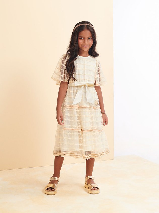 Com design único o vestido Animê vai encantar mães e filhas, feito em tule bordado com forro de tecido ele é perfeito para ser usado em ocasiões especiais como as festas de final de ano, com modelagem rodada ele ainda conta com elástico na cintura, manga evasê e babados com aviamentos. As fãs de Animê vão arrasar com esse look nas festas. Composição: 100% poliamida. Forro: 55% algodão e 45% poliéster. Ref.: N2555
