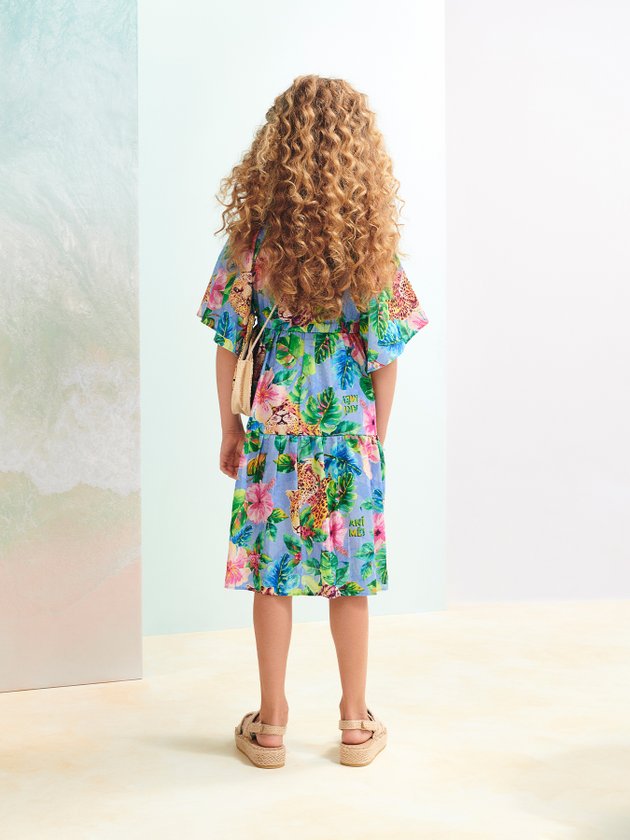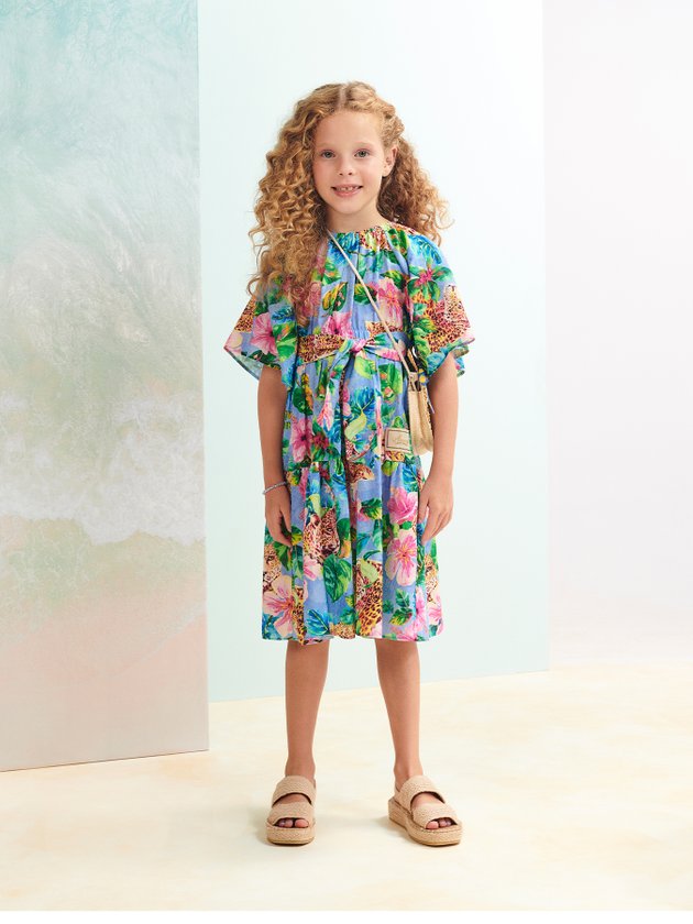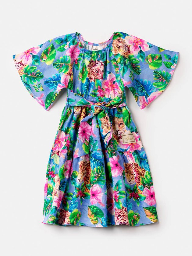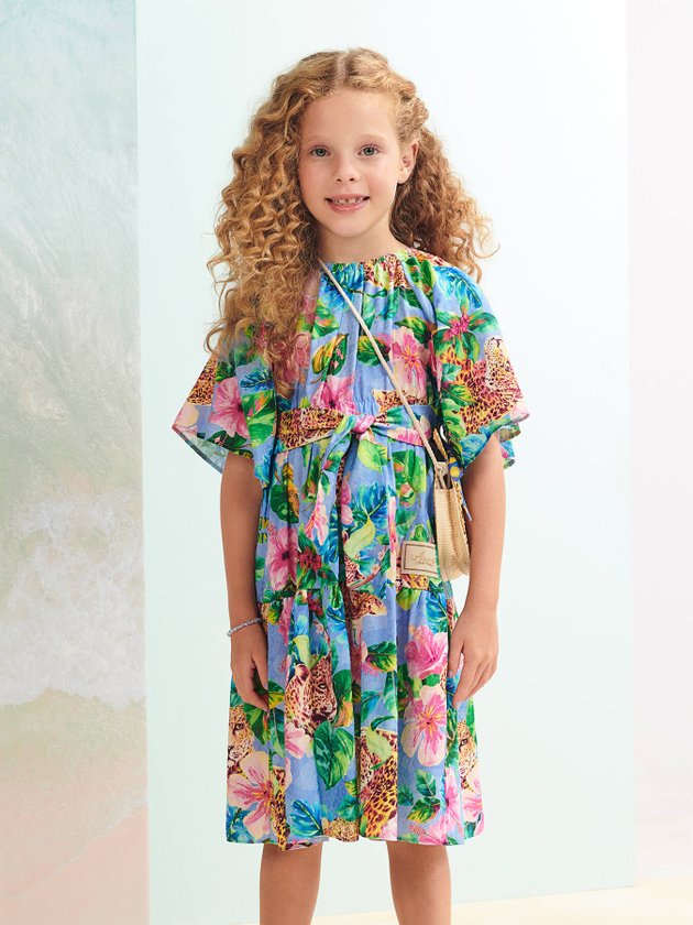 Trazendo fashionismo e modernidade ao closet das meninas, o vestido de onças na floresta Animê foi confeccionado em tecido leve com elástico funcional na cintura e faixas para amarrar e formar laço, em seus detalhes o vestido também traz mangas amplas, comprimento no joelho e etiqueta decorativa, vai conquistar mães e filhas com sua delicadeza. Composição: 100% algodão. Ref.: N2463