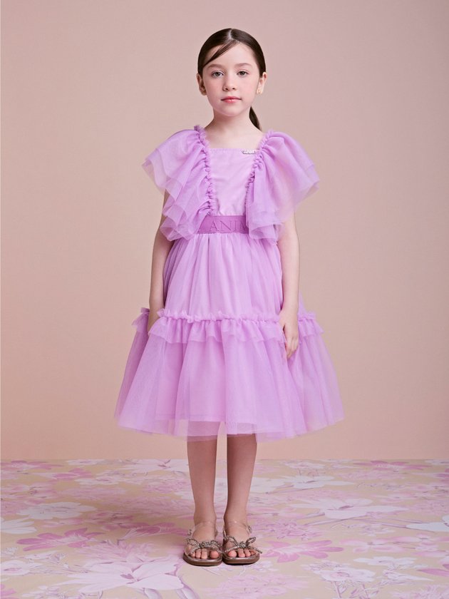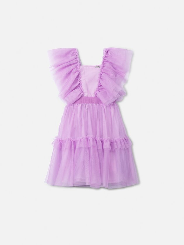 Com uma proposta leve e sofisticada, este vestido traduz o verão em forma de moda. Vestido feminino curto em tule lilás, com babados marcantes nas mangas e na saia. O vestido possui cintura marcada com faixa enfatizando a silhueta e contém detalhes em camadas de tule que conferem volume e leveza à peça.