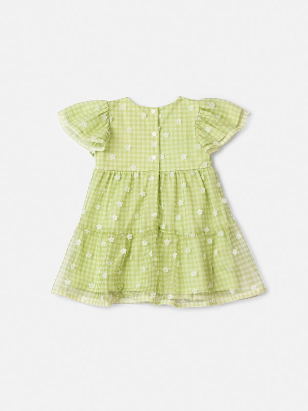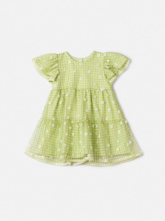 Um clássico repaginado com leveza: o vestido verde vichy recebe camada de tule floral que traz romantismo ao visual. O contraste entre a base xadrez e o floral transparente resulta em uma peça única e sofisticada. Ref.: L2565